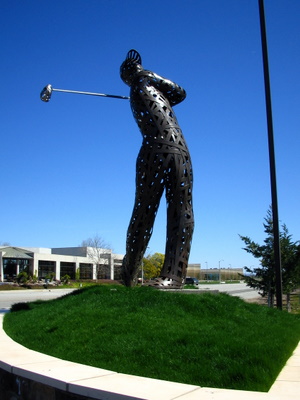 “The Big Swing”, by Michael Stutz, a 12′ tall figurative sculpture made of bronze strips intricately woven and then welded together, depicts a golfer who has just hit a powerful drive. The work adopts Stutz’s quintessential style of heroicizing figures from everyday life with his remarkable woven bronze technique.